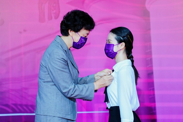 Tsinghua University Council Chairperson Chen Xu wore the Tsinghua badge for the new graduate student representative.