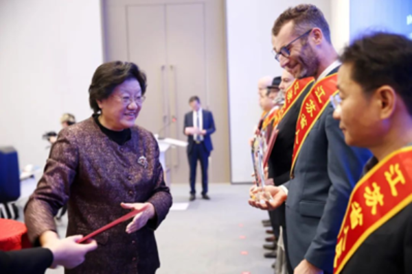 Bai Suning, president of the Jiangsu People's Association for Friendship with Foreign Countries, gives certificates to this year's envoys of friendship. [Photo/WeChat account: JiangsuNow]