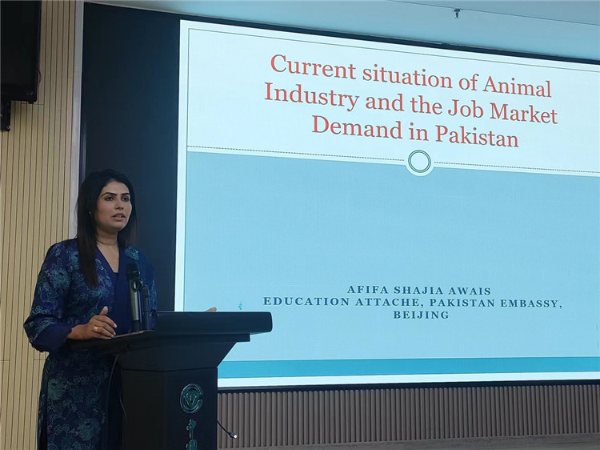 Afifa Shajia Awais, education attaché from the embassy of Pakistan in China, delivered a speech on the animal industry and job market demand in Pakistan at China Agricultural University on Saturday.