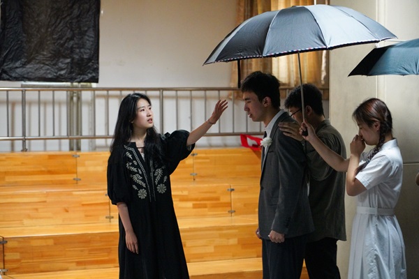 Such a large-to-small double perspective and vivid reflection of reality is attributed to one key script adapter Meng Anrui (孟安睿), a year-3 student majoring in Business Administration. Since he is a native Beijinger, the mission of recontextualizing the original play in his beloved hometown gave him enormous pride and passion. He did a lot of research and even spent time discussing the script with his family. To his delight and relief, his work paid off. Two special guests in the audience, Ms. Xiang Jie (项洁), party branch secretary of the School of International Studies, and the retired English professor Xian Xibiao (羡希彪)are both Beijing natives. They were deeply involved in this localized theatrical production and amazed by their students’ successful cross-cultural creation. In the post-performance talk, Ms. Xiang and Prof. Xian appreciated the play for refreshing their memories of Beijing over the past decades and extended their heartfelt congratulations to the crew on their achievement.