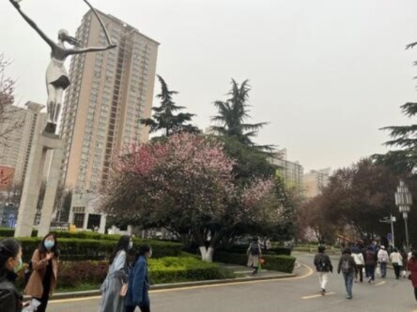 The tree in this picture is in its full blossom. What makes the tree impressive is that it boasts flowers of three different colors in one single tree, and the statue next to it is the landmark symbol nicknamed “the Goddess of Lamian noodles”. The reason why it got this hilarious nickname was because the statue girl, who was obviously doing gymnastics, reminded people the scene of a person pulling noodles with hands.