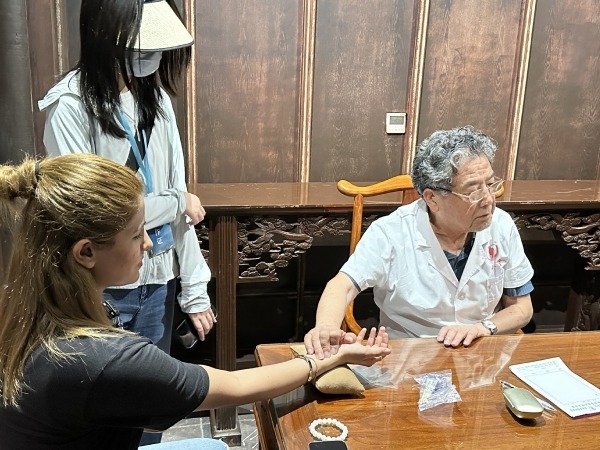 A doctor checks the pulse of a tourist at the Medical Sage Cultural Park in Nanyang, Central China's Henan province, on Aug 18, 2024. [Photo by Dong Senhe/chinadaily.com.cn]