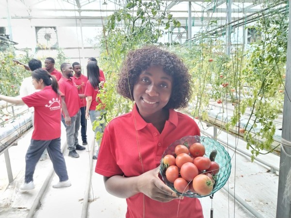 An African student displays a bowl of tomatoes at a greenhouse in Quzhou county, Handan, Hebei province. [Photo provided to chinadaily.com.cn]