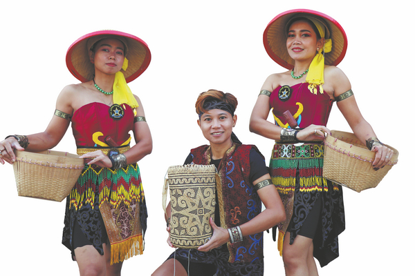 The dancers' costumes, decorated with vibrant yellow and blue vine patterns, are the work of Ucix herself. These intricate designs are inspired by Dayak patterns from Kalimantan, a region in Indonesia known for its geometric motifs drawn from nature — flowers, animals and flowing water.