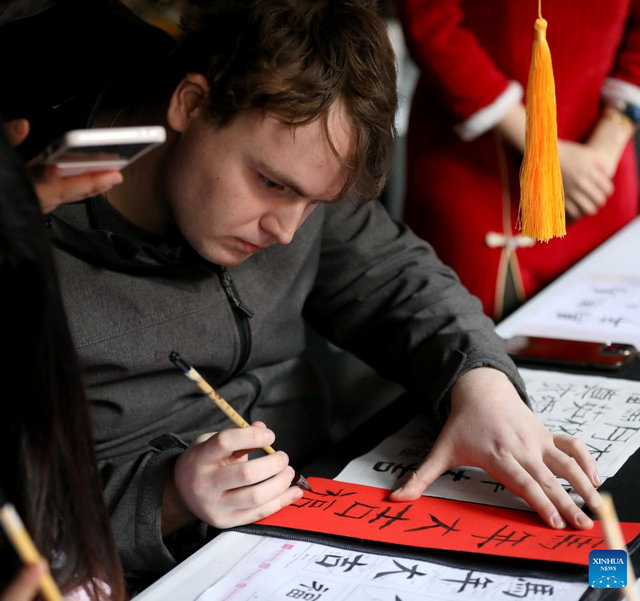 A man tries Chinese calligraphy during a Chinese New Year celebration at Camden Market in London, Britain, Feb 21, 2026.[Photo/Xinhua]