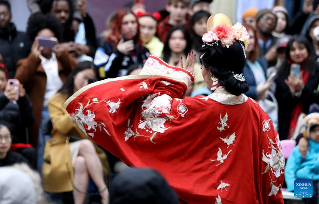 People watch traditional Chinese costume performance during a Chinese New Year celebration at Camden Market in London, Britain, Feb 21, 2026.[Photo/Xinhua]