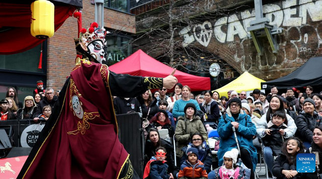 People watch Sichuan Opera face-changing performance during a Chinese New Year celebration at Camden Market in London, Britain, Feb 21, 2026.[Photo/Xinhua]